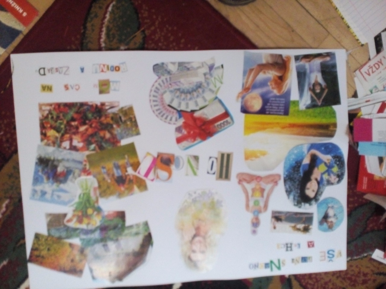 Ráda používám mentální mapu svých přání, její sestavení je jednoduché a přináší rychlé výsledky. Pokud se rozhodnete si vytvořit takovou mapu svých přání, nedávejte jich tam mnoho, nejlépe pro začátek tak tři, posléze je můžete postupně, jak se vám plní, přelepovat. Je to hravá činnost, která rozvíjí nenásilnou formou i vaši kreativitu a je velmi oblíbená i dětmi. V zásadě potřebujete velký papír nejlépe formát A1 neboA2 a spostu časopisů. Na svá přání vyhledávejte vhodné obrázky pro symboliku vašeho podvědomí, aby jste dali najevo, co si přejete. Podvědomí komunikuje hlavně v obrazech. Pokud si přejete dům, najděte takový , který nejépe vyhovuje vaší představě, pro šťastnou rodinu najděte jakoukoli rodinu nbo použijte fotogragie. Po výběru obrázků doplňte vše vybranými texty. Opět vystříhané, ne mnoho slov, spíše upřesnění cíle např - můj šťasný domov, má zdravá rodina a podobně. Hrajte si tak dlouho, až budete s výsledkem spokojeni a bude na vás dobře působit. Pak si tuto mapu pověste nebo umístěte tak, abyste na ni viděli,nejčastěji se používá ložnice. Není určena cizím očím, vždyť jsou to vaše osobní příní a touhy.